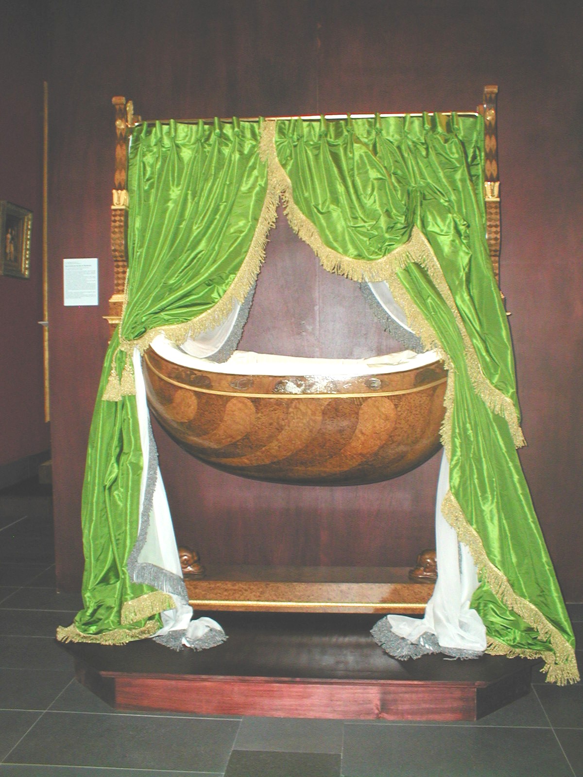 Chef d’oeuvre de l’ébéniste Félix RÉMOND (1779-1860) en loupe d’amboine, loupe de frêne et ronce de noyer, ornée de bronzes ciselés et sculptés, cette bercelonnette est celle qui servit au duc de Bordeaux, fils de la duchesse de Berry et héritier du trône, dans ses appartements des Tuileries. Récemment retrouvée dans les réserves du château de Compiègne, elle a été entièrement restaurée et est présentée pour la première fois au public à l’occasion de l’exposition.».